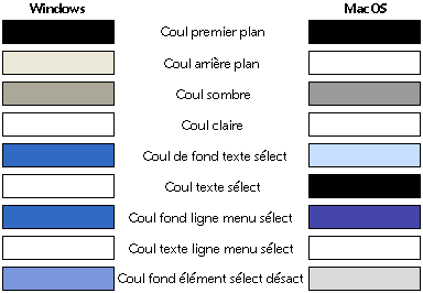 ATTENTION : Notez que, sous Windows, ces couleurs automatiques dépendent du système. Si vous modifiez vos couleurs système dans le Panneau de configuration "Affichage", les couleurs automatiques de 4e Dimension seront modifiées en conséquence. Utilisez les valeurs de couleurs automatiques pour assigner à des objets les couleurs système, et non pour leur assigner les mêmes couleurs que celles définies dans l'exemple ci-dessus.