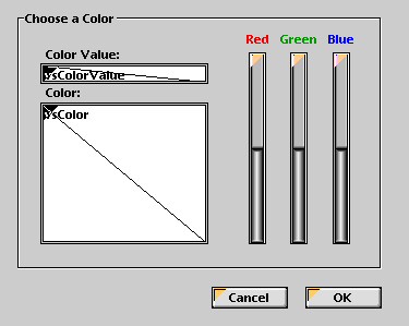 Voici un formulaire contenant deux variables non saisissables, vsColorValue et vsColor ainsi que trois thermomètres, thRouge, thVert et thBleu :
