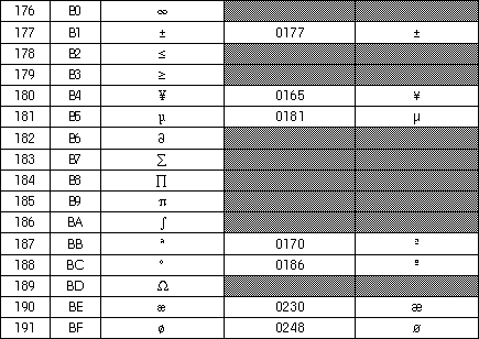Note : Les cases grisées signalent des caractères non disponibles sous Windows, ou différents des caractères Macintosh.