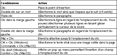 4D Write propose les raccourcis suivants utilisant les clics souris :