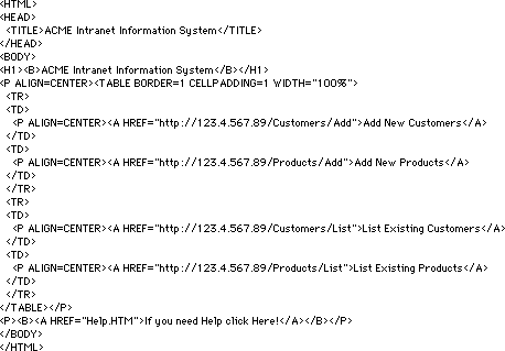Anders gesagt, die HTML Seite ACME_IS.HTM ist die lokale Client Home Page für das auf 4D basierende Informationssystem der Organisation. Klickt ein Benutzer auf das Link Add New Products, baut der Web Browser die Verbindung zum Host über die URL http://123.4.567.89/Products/Add auf. Unter der Voraussetzung, dass die IP Adresse des Rechners mit der Datenbank 123.4.567.89 ist, erhält die Datenbankmethode On Web Connection die zusätzlichen URL Daten "/Products/Add" in $1, und beginnt somit, Datensätze in der Tabelle [Products] hinzuzufügen.