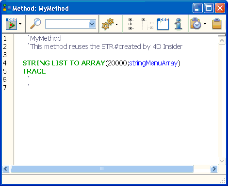 Mit 4D Insider können Sie die Bezeichnungen der Menüleiste in Referenzen auf Strings umwandeln, die in STR# Ressourcen gespeichert sind.