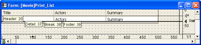 C_LONGINT($l;$t;$r;$b;$fixed_wdth;$exact_hght;$l1;$t1;$r1;$b1) C_LONGINT($final_pos;$i) C_LONGINT($detail_pos;$header_pos;$hght_to_print;$hght_remaining) Case of : (vSprint_area="Detail") `Printing of detail underway GET OBJECT RECT([Film]Actors;$l;$t;$r;$b) $fixed_wdth:=$r-$l `Calculation of the Actors text field size $exact_hght:=$b-$t BEST OBJECT SIZE([Film]Actors;$wdth;$hght;$fixed_wdth) `Optimale Feldgrösse gemäss dessen Inhalt $movement:=$hght-$exact_hght GET OBJECT RECT([Film]Summary;$l1;$t1;$r1;$b1) $fixed_wdth1:=$r1-$l1 `Berechnet die Grösse des Textfeldes Summary $exact_hght1:=$b1-$t1 BEST OBJECT SIZE([Film]Summary;$wdth1;$hght1;$fixed_wdth1) `Optimale Feldgrösse gemäss dessen Inhalt $movement1:=$hght1-$exact_hght1 If($movement1>$movement) `Wir legen das höchste Feld fest $movement:=$movement1 End if If($movement>0) $position:=Get print marker(Form Detail) $final_pos:=$position+$movement `Wir bewegen die Marke Detail und darauffolgende Marken SET PRINT MARKER(Form Detail ;$final_pos;*) `Resizing of text areas MOVE OBJECT([Film]Actors;$l;$t;$r;$hght+$t;*) MOVE OBJECT([Film]Summary;$l1;$t1;$r1;$hght1+$t1;*) `Trennlinien anpassen GET OBJECT RECT(*;"H1Line";$l;$t;$r;$b) MOVE OBJECT(*;"H1Line";$l;$final_pos-1;$r;$final_pos;*) For ($i;1;4;1) GET OBJECT RECT(*;"VLine"+String($i);$l;$t;$r;$b) MOVE OBJECT(*;"VLine"+String($i);$l;$t;$r;$final_pos;*) End for End if `Verfügbaren Platz berechnen $detail_pos:=Get print marker(Form Detail) $header_pos:=Get print marker(Form Header) $hght_to_print:=$detail_pos-$header_pos $hght_remaining:=printing_height-vLprinted_height If($hght_remaining<$hght_to_print) `Ungenügende Höhe CANCEL `Bewegt Formular zur nächsten Seite End if End case