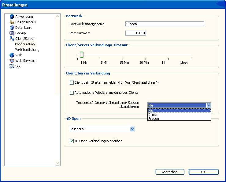 Wählen Sie dazu in den Einstellungen der Datenbank unter dem Thema Client-Server >Konfiguration die Option "Client beim Starten anmelden":