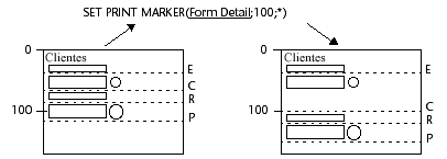 El comando SET PRINT MARKER permite definir la posición de un marcador durante la impresión. Combinado con los comandos Get print marker, MOVE OBJECT o Print form, este comando le permite ajustar el tamaño de las áreas de impresión.