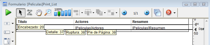 C_LONGINT($l;$t;$r;$b;$fixed_wdth;$exact_hght;$l1;$t1;$r1;$b1) C_LONGINT($final_pos;$i) C_LONGINT($detalle_pos;$encabezado_pos;$altura_a_imprimir;$altura_restante) Case of : (vSprint_area="Detalle") `Impresión del detalle en proceso GET OBJECT RECT([Peliculas]Actores;$l;$t;$r;$b) $largo_fijo:=$r-$l `Cálculo del tamaño del campo tipo texto Actores $altura_exact:=$b-$t BEST OBJECT SIZE([Peliculas]Actores;$largo;$alto;$largo_fijo) `Tamaño óptimo del campo de acuerdo a su contenido $movimiento:=$alto-$altura_exact GET OBJECT RECT([Peliculas]Resumen;$l1;$t1;$r1;$b1) $largo_fijo:=$r1-$l1 `Cálculo del tamaño del campo tipo texto Resumen $altura_exact1:=$b1-$t1 BEST OBJECT SIZE([Peliculas]Resumen;$largo1;$alto1;$largo_fijo) `Tamaño óptimo del campo de acuerdo a su contenido $movimiento1:=$alto1-$altura_exact1 If($movimiento1>$movimiento) `Determinamos el campo más alto $movimiento:=$movimiento1 End if If($movement>0) $posicion:=Get print marker(Form Detail) $final_pos:=$posicion+$movimiento `Nos movemos al marcador Detalle y a los que siguen SET PRINT MARKER(Form Detail ;$final_pos;*) `Redimensionamiento de las áreas de texto MOVE OBJECT([Peliculas]Actores;$l;$t;$r;$hght+$t;*) MOVE OBJECT([Peliculas]Resumen;$l1;$t1;$r1;$alto1+$t1;*) `Redimensionamiento de las líneas de división GET OBJECT RECT(*;"H1Linea";$l;$t;$r;$b) MOVE OBJECT(*;"H1Line";$l;$final_pos-1;$r;$final_pos;*) For ($i;1;4;1) GET OBJECT RECT(*;"VLinea"+Cadena($i);$l;$t;$r;$b) MOVE OBJECT(*;"VLinea"+Cadena($i);$l;$t;$r;$final_pos;*) End for End if `Cálculo del espacio disponible $detalle_pos:=Get print marker(Form Detail) $encabezado_pos:=Get print marker(Form Header) $altura_a_imprimir:=$detalle_pos-$encabezado_pos $altura_restante:=altura_impreso-vLaltura_impreso If($altura_restante<$altura_a_imprimir) `Altura insuficiente CANCEL `Pasar la línea a la siguiente página End if End case