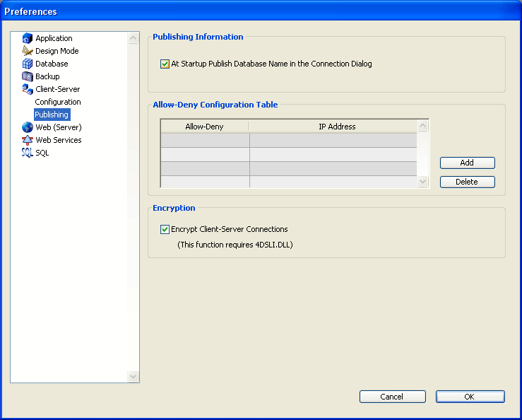 On the other hand, the encryption of 4D Server connections is not activated by default. You should activate this mode: open the "Client-Server/Publishing" page of the application Preferences dialog box and select the option Encrypt Client/Server Connections in the "Encryption" area: